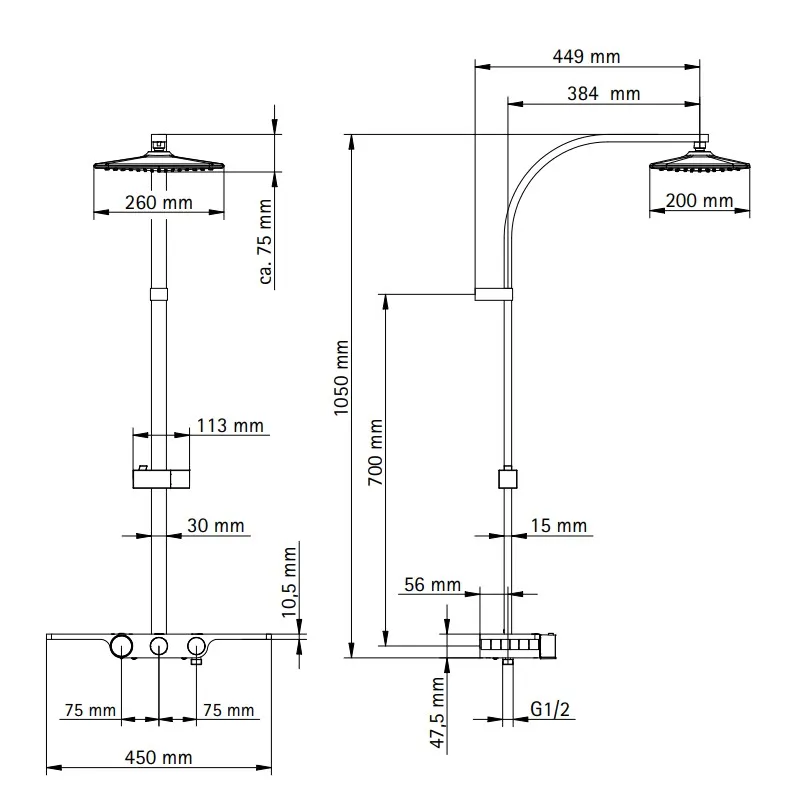 DuschMaster Rain II mit Thermostat und Ablage, Chromoptik, 450 x 1025 mm