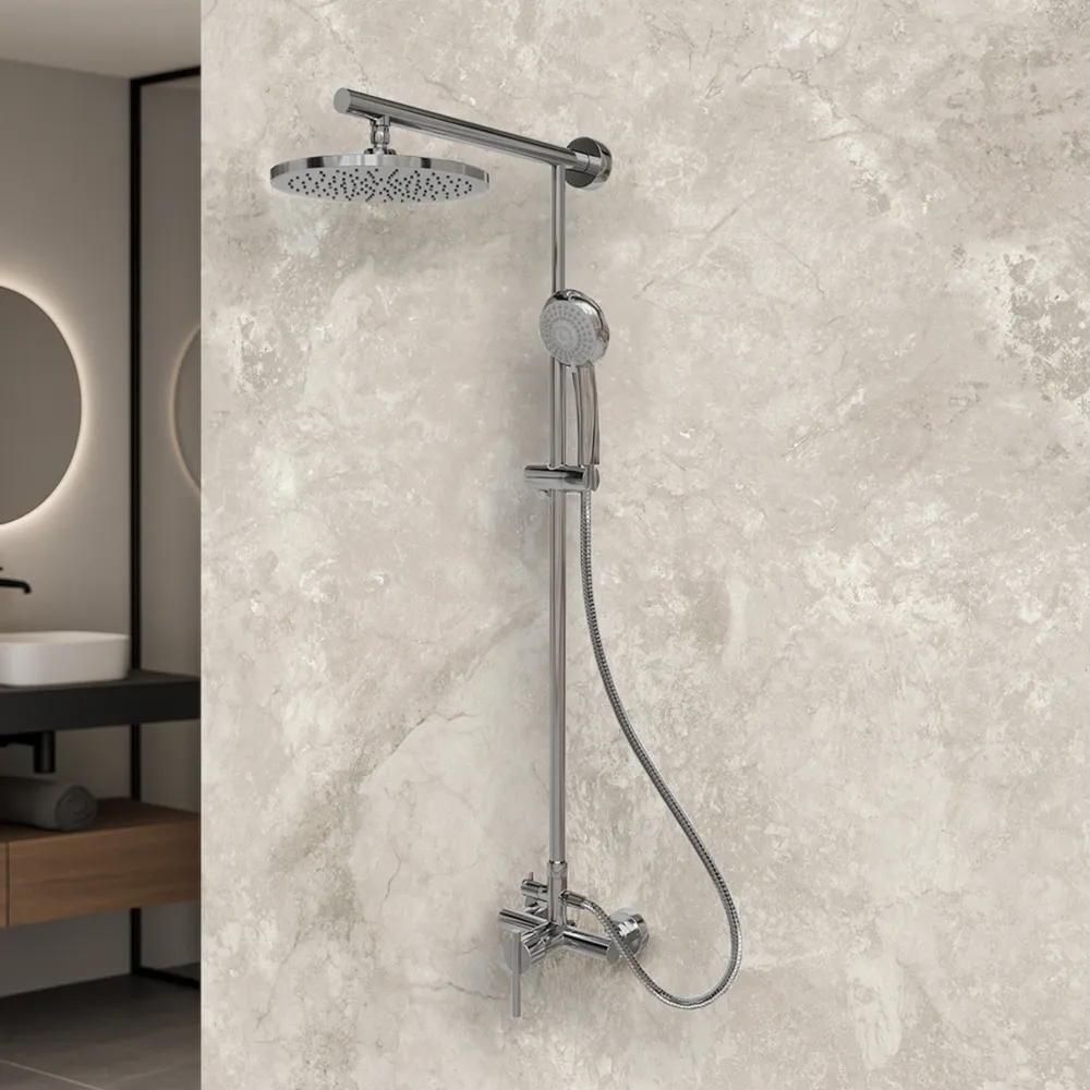 Komplett ausgestattet für maximalen Duschkomfort – mit Einhebelmischer, praktischem Umsteller, großzügiger Tellerkopfbrause und flexibler Handbrause.