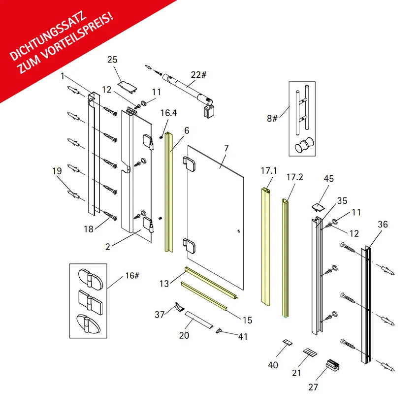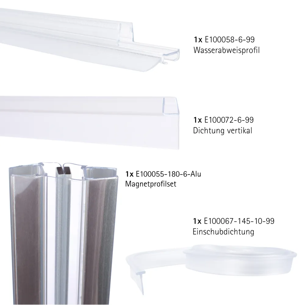 Dichtungssatz für 6 mm Drehtür an Nebenteil (breit) in Nische (Chromoptik)
