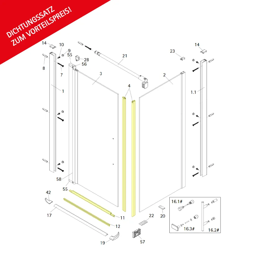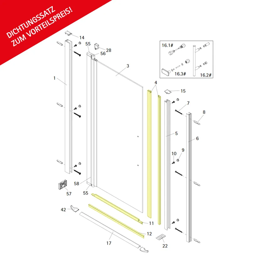Zur kompletten Erneuerung der Abdichtungen Ihrer Drehtür inkl. Seitenwand der Serie Black Style. Mit dem Einsatz dieses Dichtungssatzes wird ein zuverlässiger Spritzschutz erreicht.